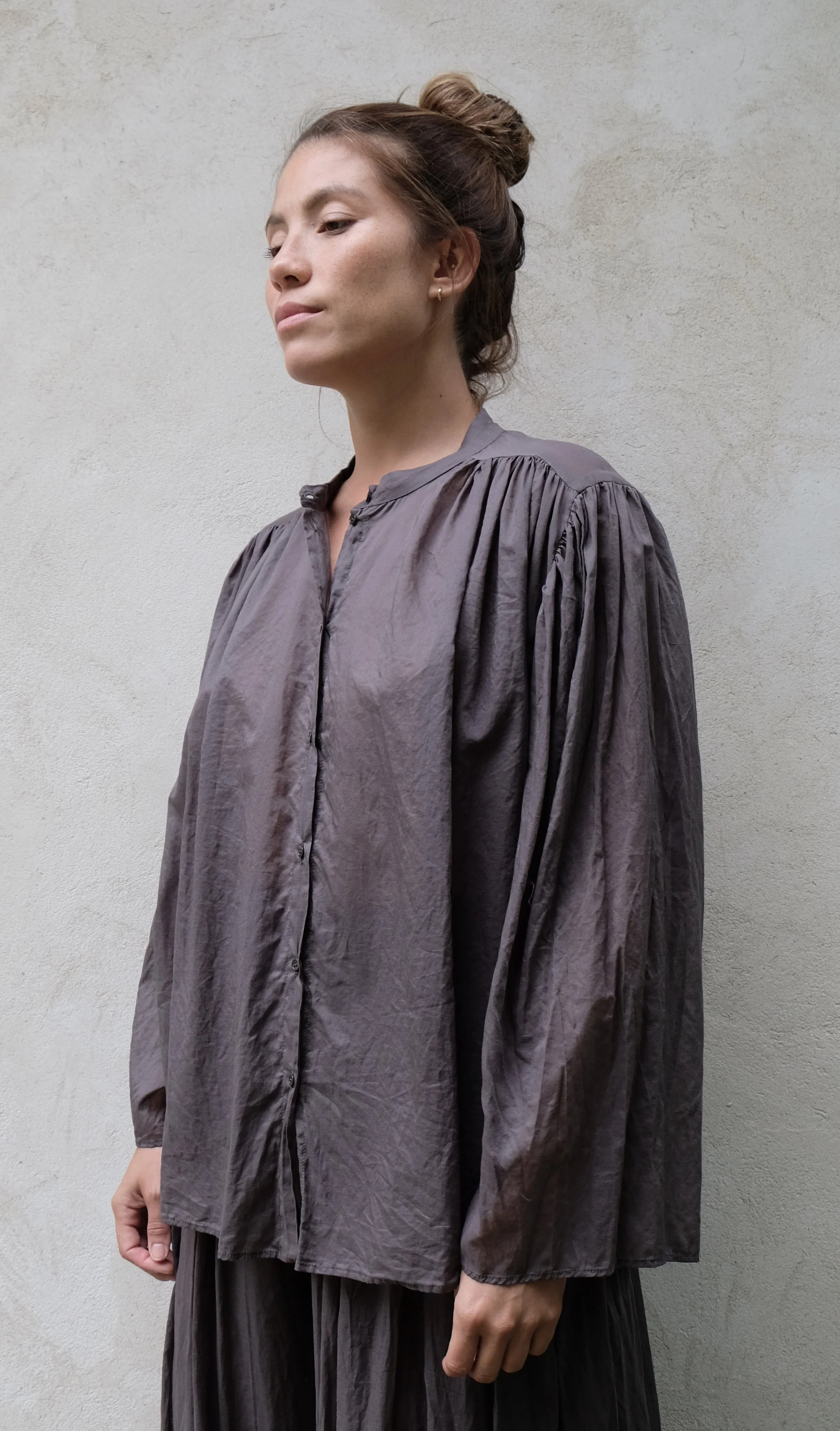 Loose-fitted, stand collar shirt with gathers at the shoulders and at the top of the sleeves. It closes at the front with mother-of-pearl buttons and the shirt measures 69 cm from shoulder down.